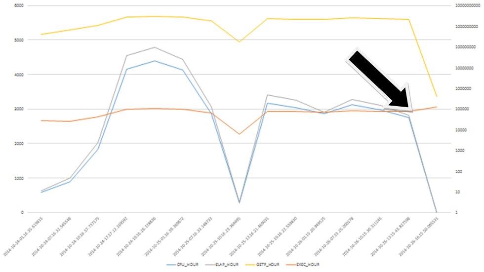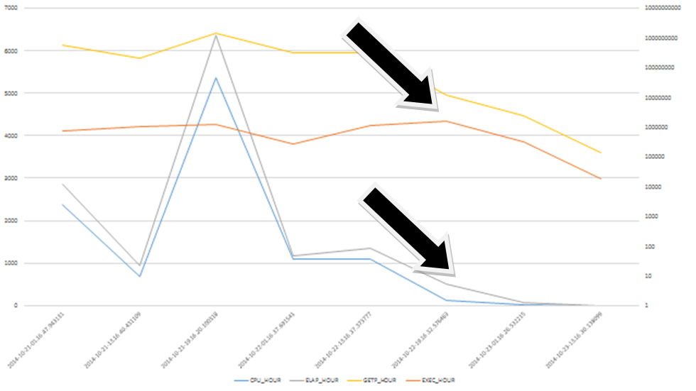 Again, looking at the per hour data, you can see a nice “dive” effect right after an index on all columns was created (Last three data points in this case). Good catch, eh?