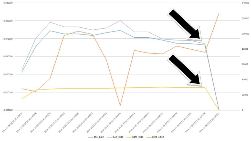 Viewing the same data in a different way, (now on the per execution level instead of the per hour level) the results shown below look even better! (The left hand scale is seconds and the right hand scale is absolute numbers):