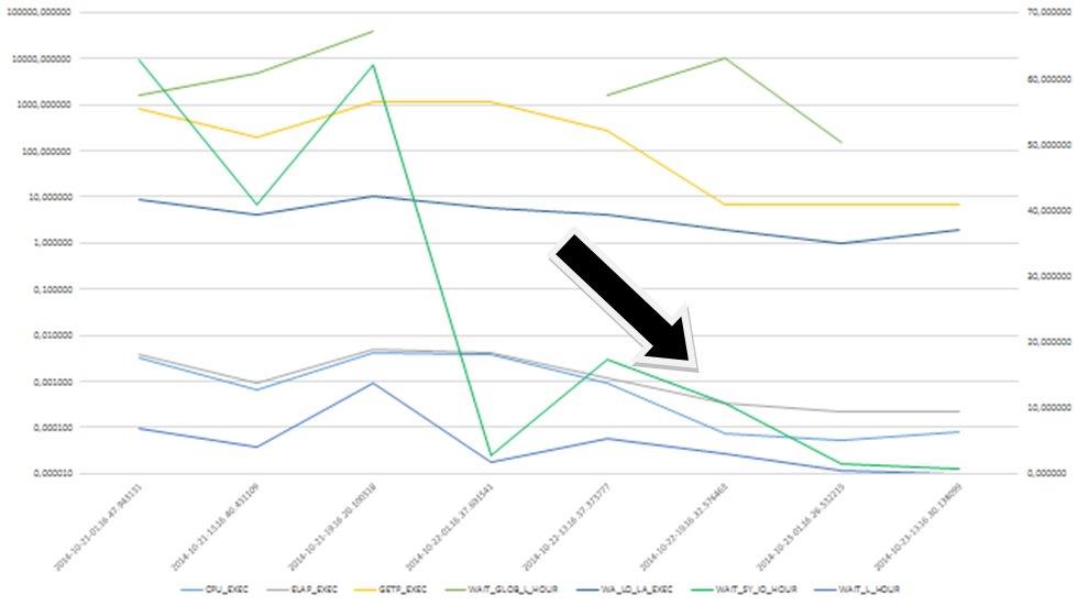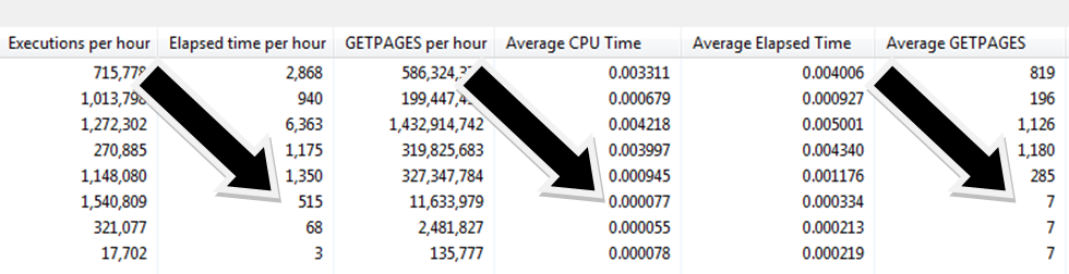 What you can see on the right side of the graph, is a dramatic drop in CPU and Elapsed and Getpages while the execution rate is constant. This was achieved by simply adding an appropriate index for that query.